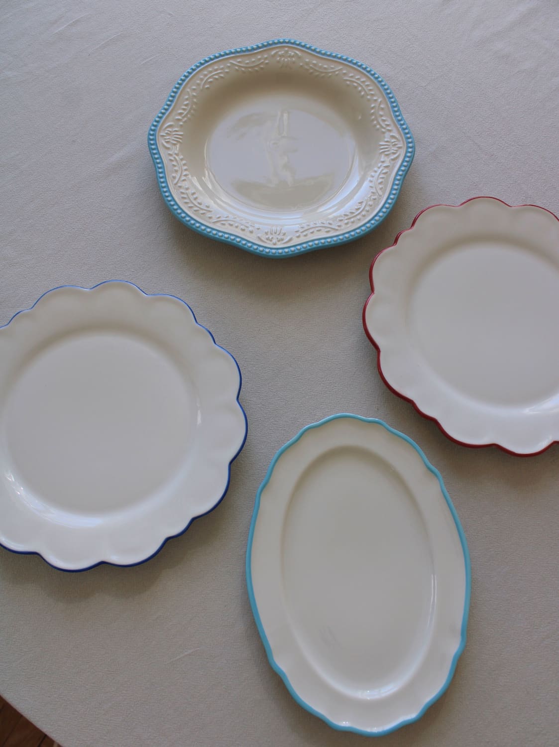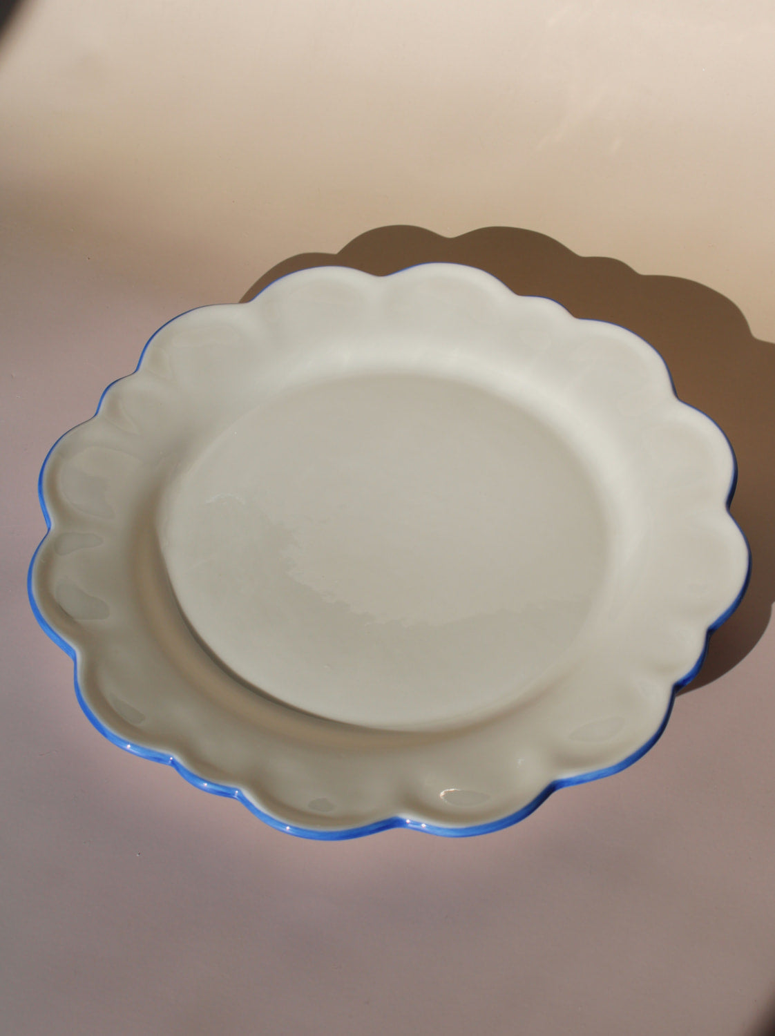- Matériau : Céramique blanche de haute qualité avec liseré festonné bleu