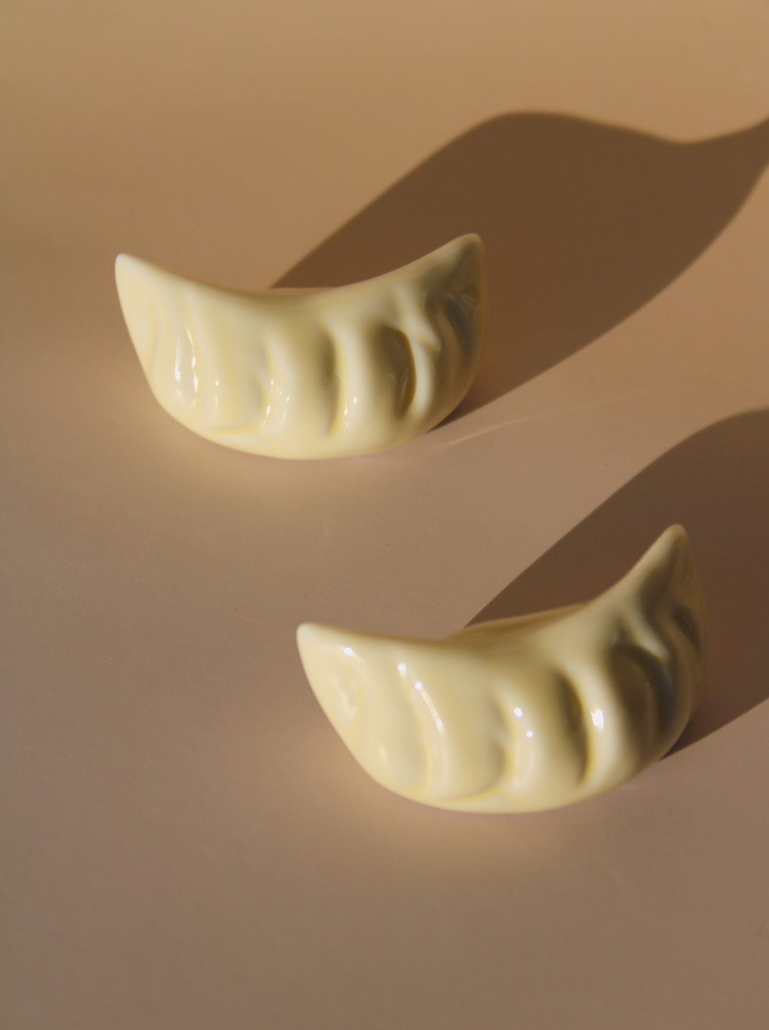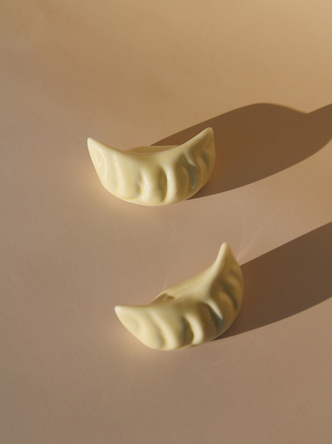 Charmant et fonctionnel, ce repose-baguettes en céramique en forme de ravioli apporte une touche d'élégance ludique à votre table. Vendus par lot de deux, ces pièces sculpturales sont idéales comme repose-baguettes pendant les repas ou comme délicats poids de serviette pour les repas en extérieur. Les détails plissés sculptés à la main capturent l'art des raviolis faits maison, ajoutant une touche de fantaisie à votre table tout en étant pratiques.