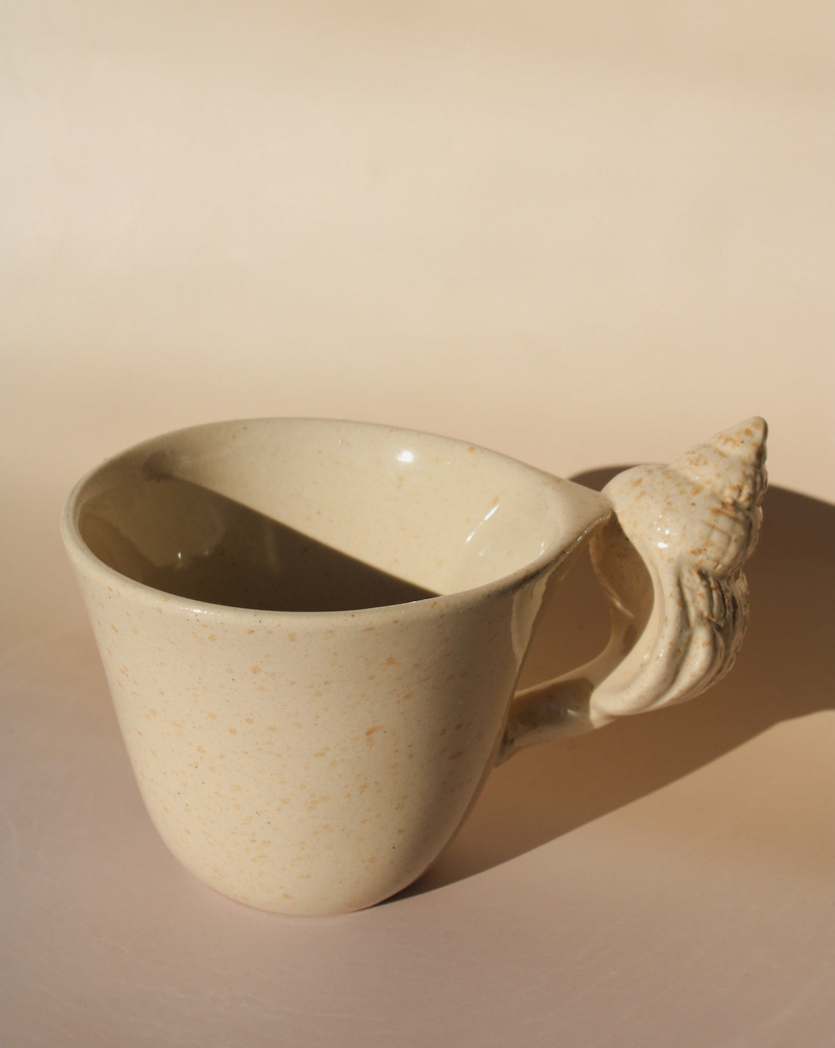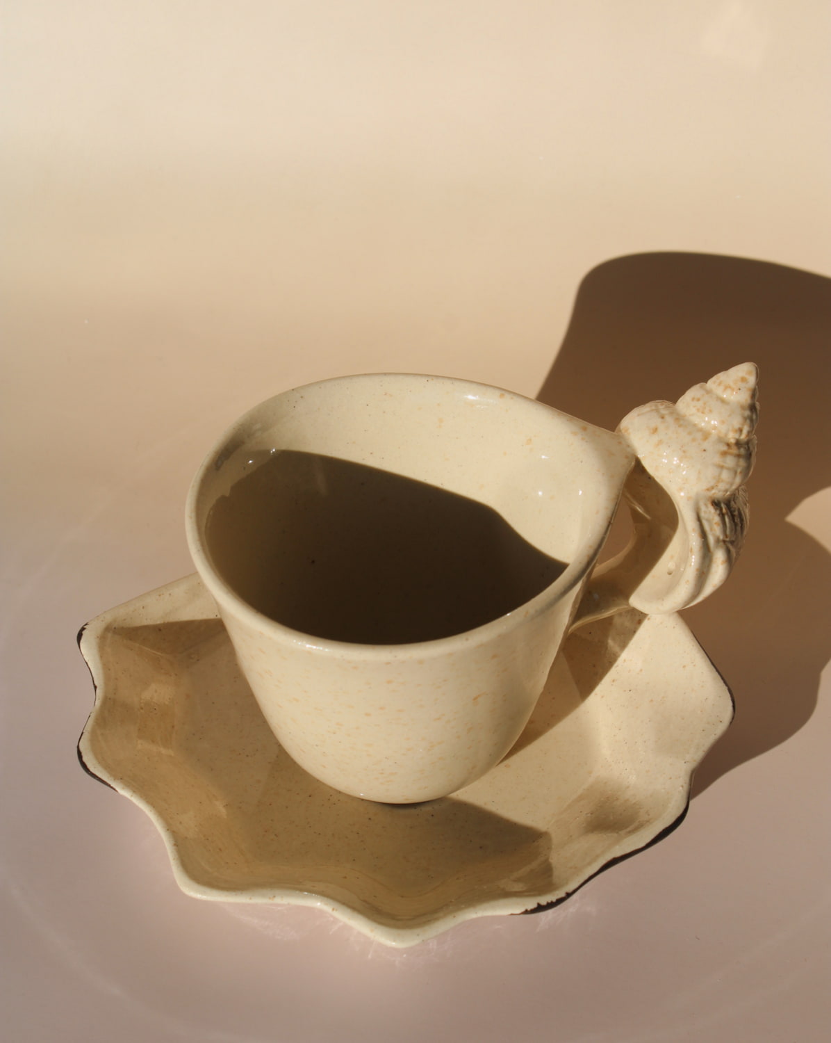 Une tasse et une soucoupe qui évoquent un murmure marin. L'émail crémeux, parsemé de variations naturelles, épouse l'anse sculpturale en forme de coquillage, transformant un rituel quotidien en un moment de douceur et de charme. La soucoupe qui l'accompagne, aux courbes douces, semble modelée par les marées.