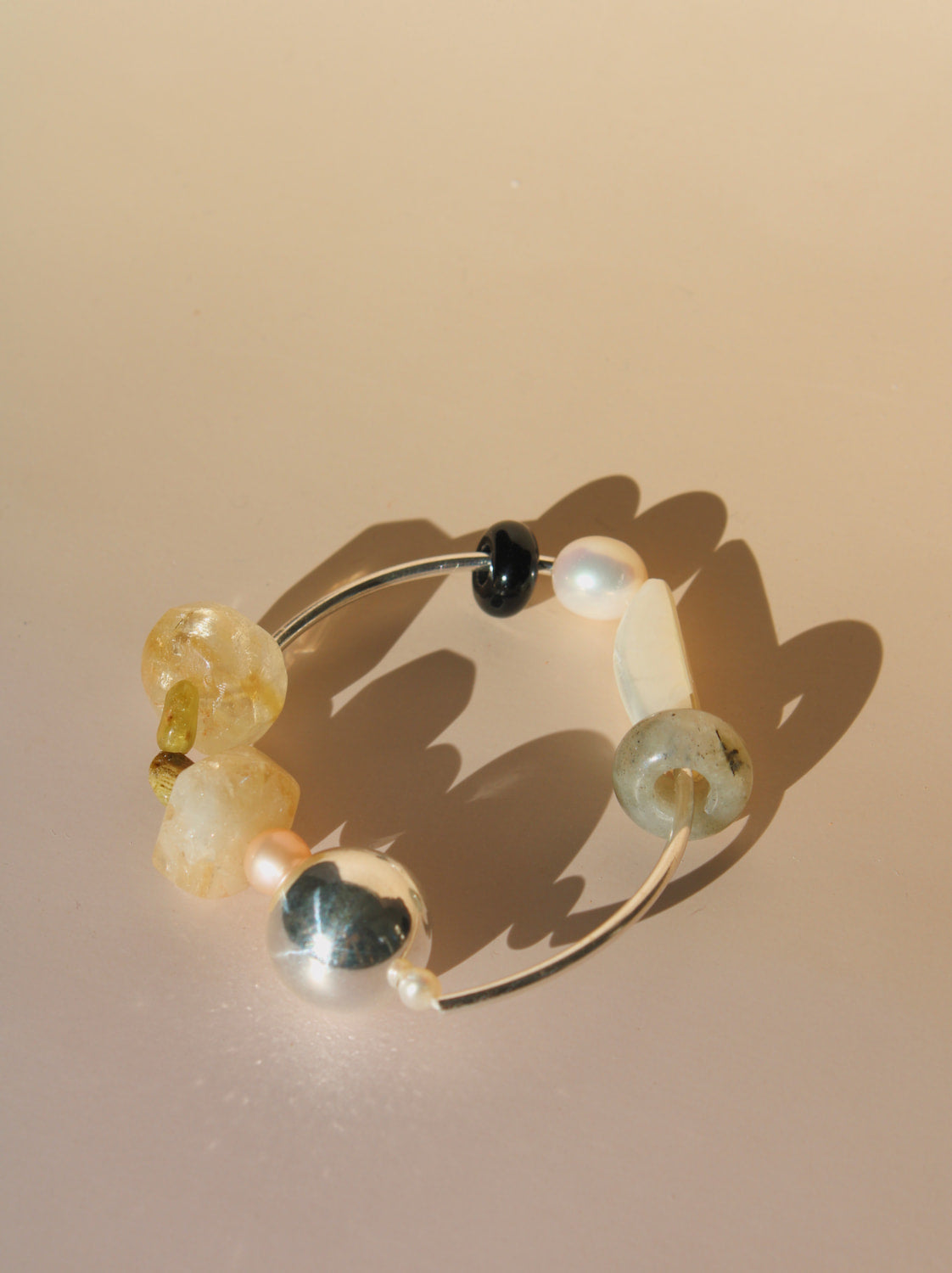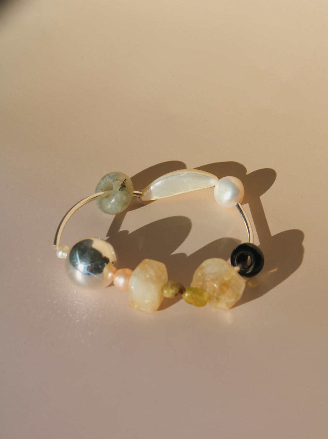 Bracelet Solune — une danse cosmique des énergies du soleil et de la lune, capturée dans une œuvre d'art intemporelle. Fabriqué à la main avec un mélange soigneusement équilibré de citrine jaune, de perles d'eau douce, d'agate noire, d'améthyste et d'argent pur, ce bracelet incarne le mystère et le mouvement de l'univers.