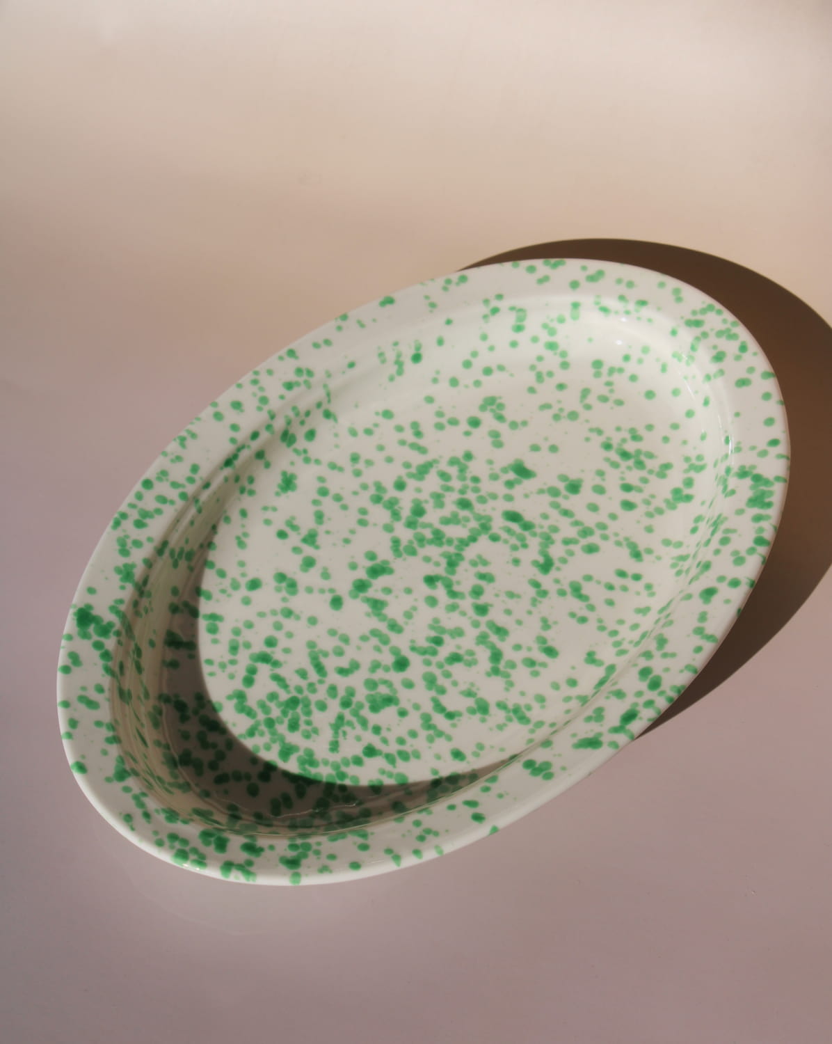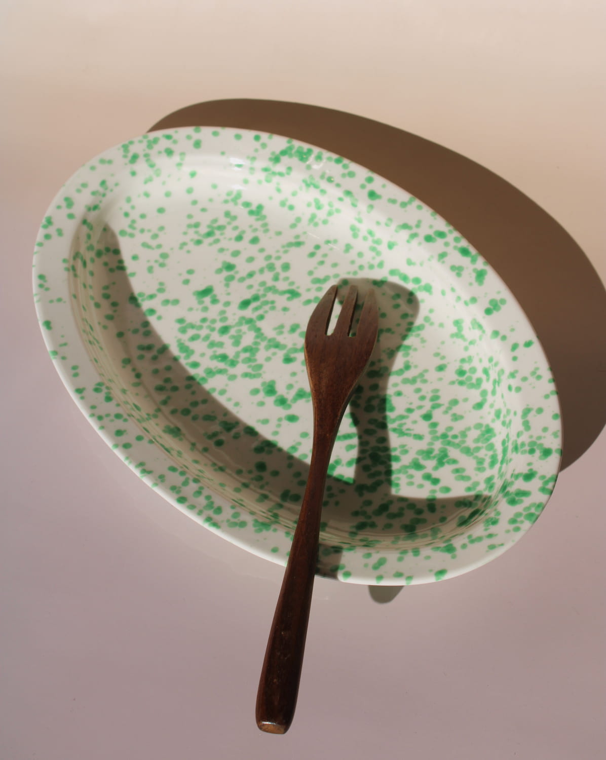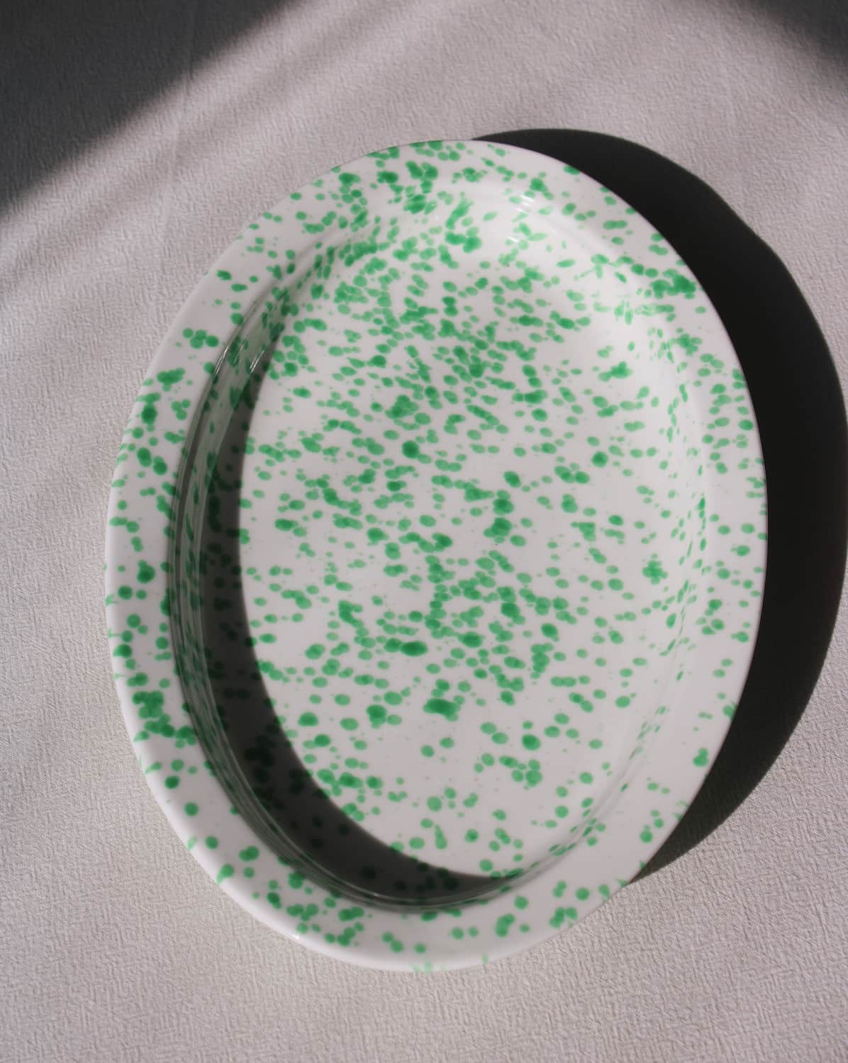 Giocoso ma raffinato, il piatto Verda è punteggiato di verde fresco, donando un ritmo vivace ai vostri momenti a tavola. La sua forma ovale lo rende perfetto per insalate, secondi piatti o piatti da condividere: un pezzo versatile, moderno e di carattere. Ogni piatto presenta leggere variazioni, rendendo unica ogni tavola apparecchiata.