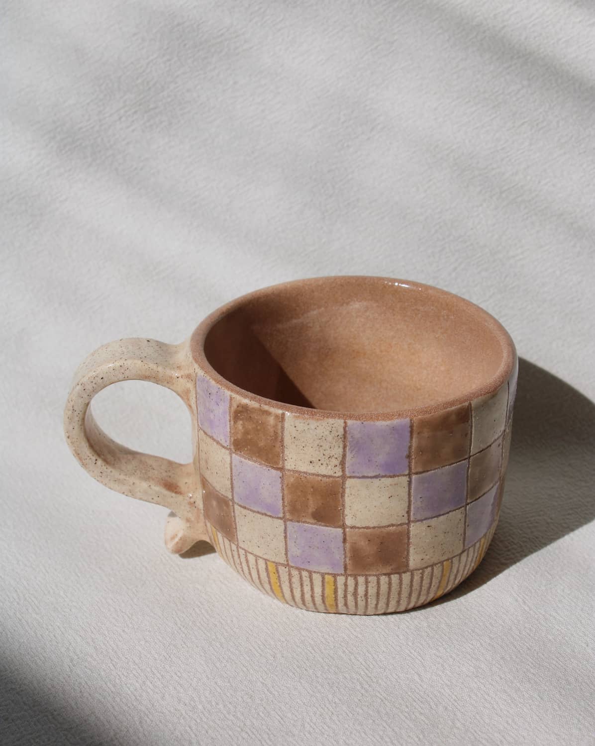 Gentle lilac squares meet warm earthy tones in the Calla Mug, a piece that feels both playful and serene. Hand-painted golden lines add a subtle touch of brightness, while the softly rounded form sits comfortably in your hand. Whether for a quiet morning coffee or an evening tea, Calla brings a little poetry to your daily rituals.