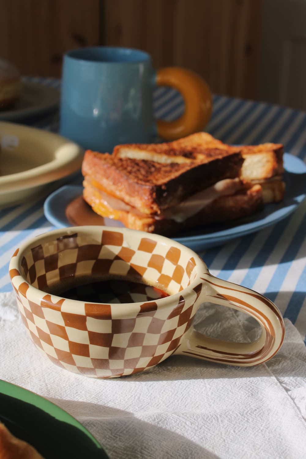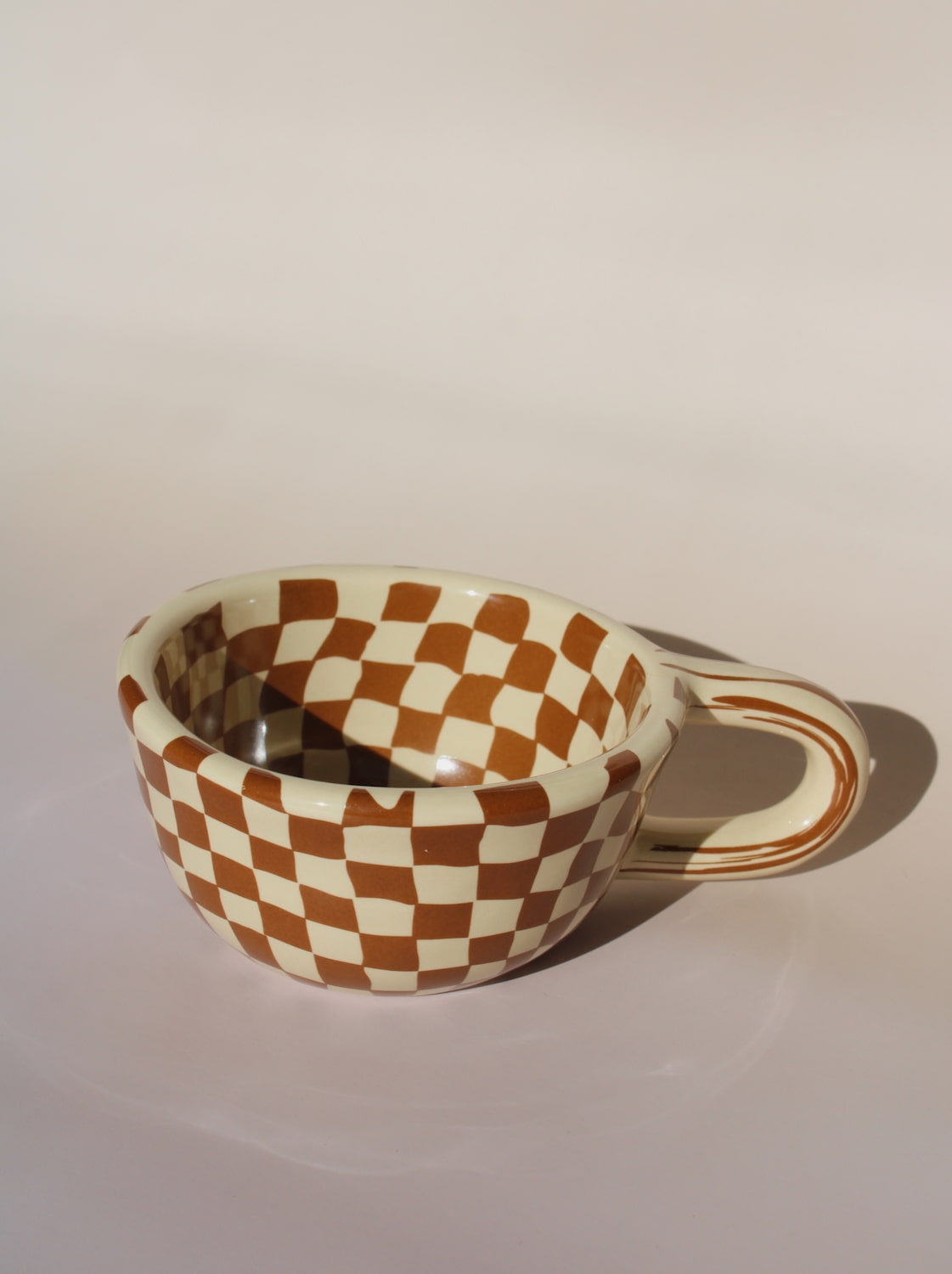 Bold and graphic, the Nova mug features a striking checkered pattern in warm brown and cream that brings retro charm to your daily routine. The geometric design and comfortable proportions make it perfect for coffee, tea, or any favorite beverage. This eye-catching piece adds personality to your table while maintaining the quality craftsmanship you expect.