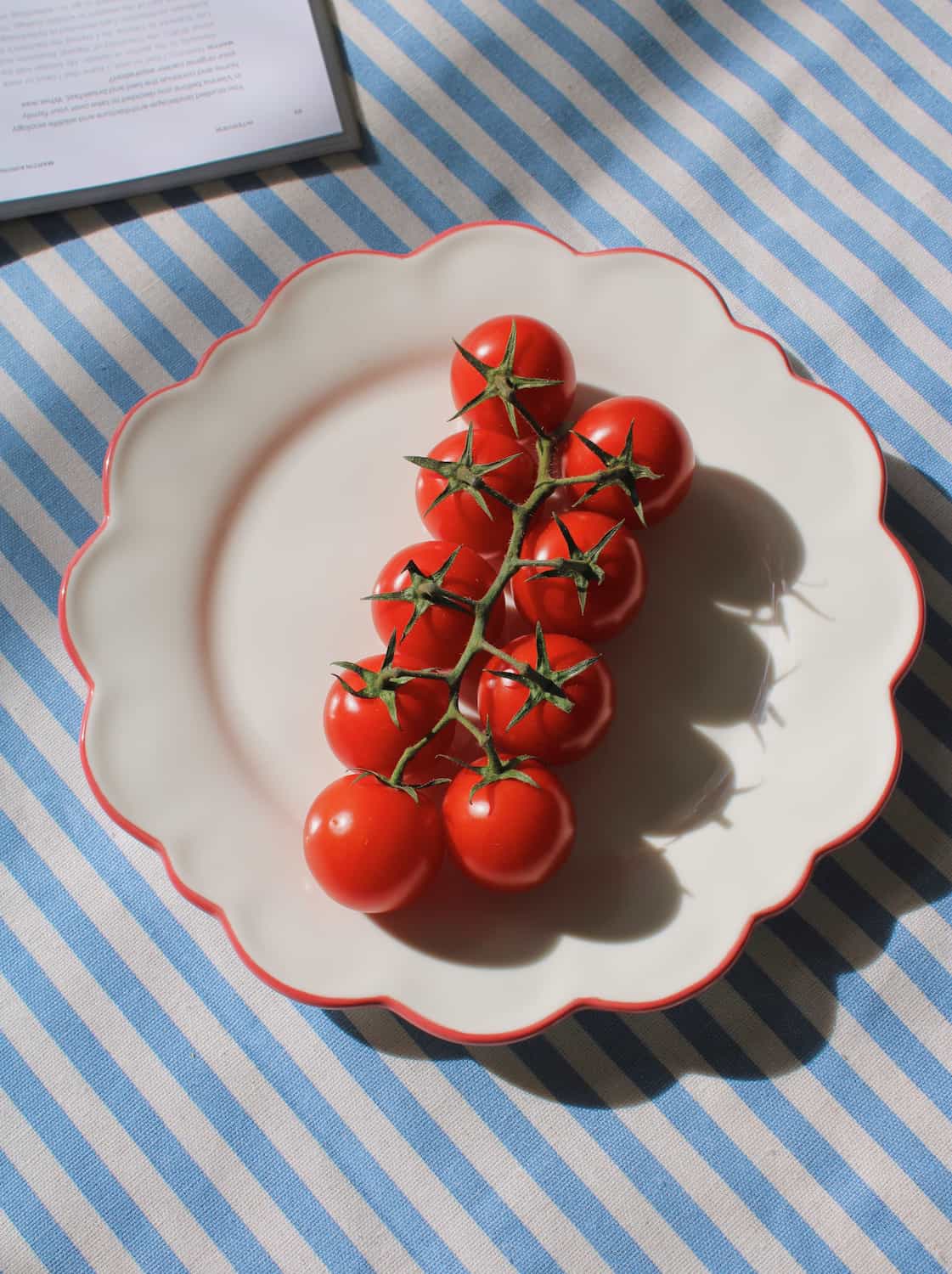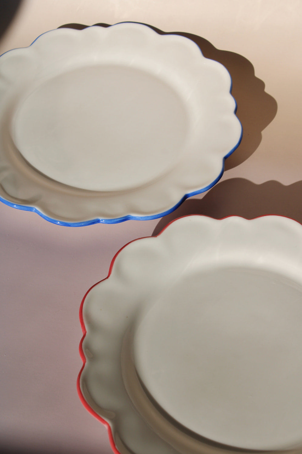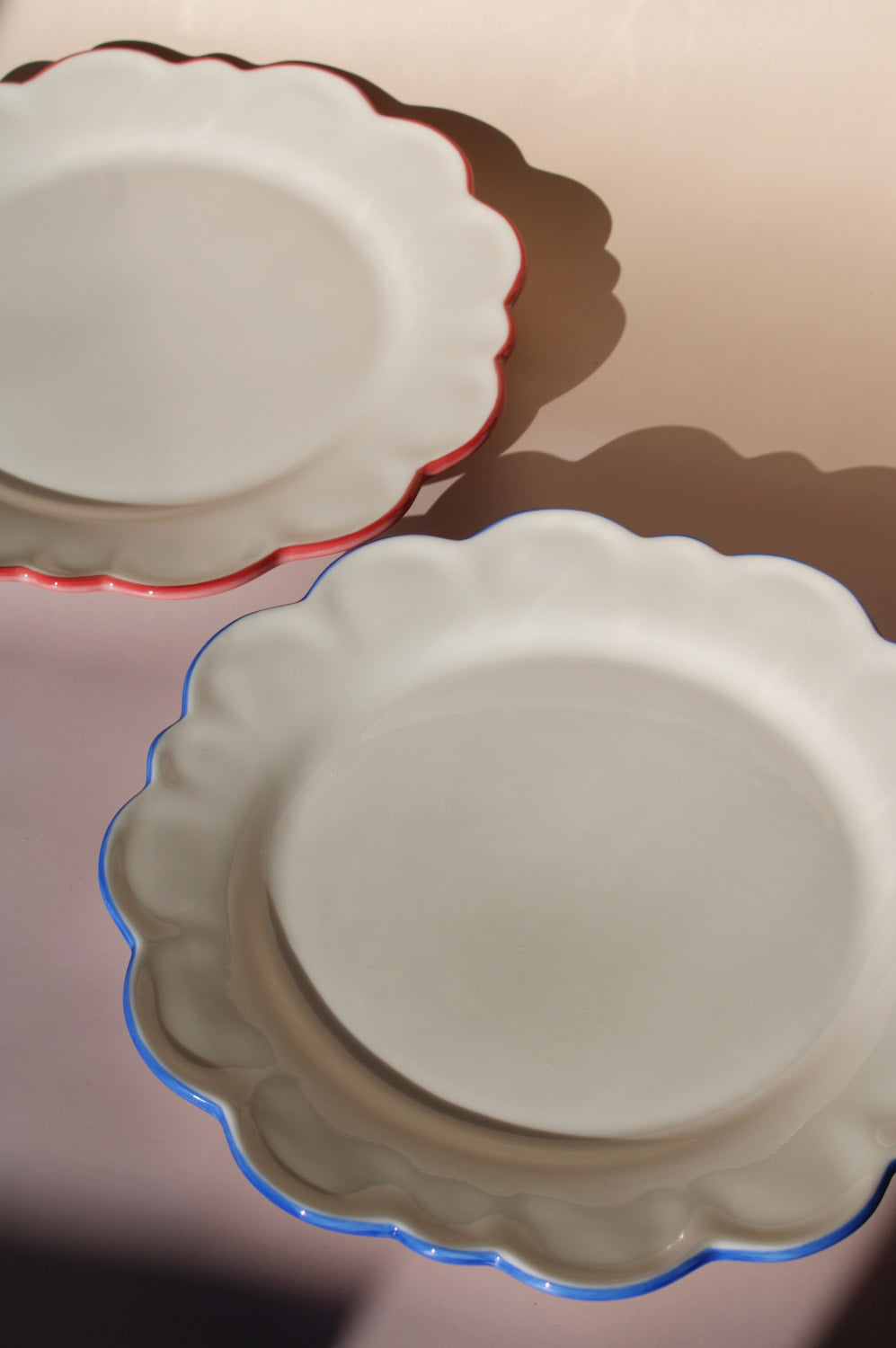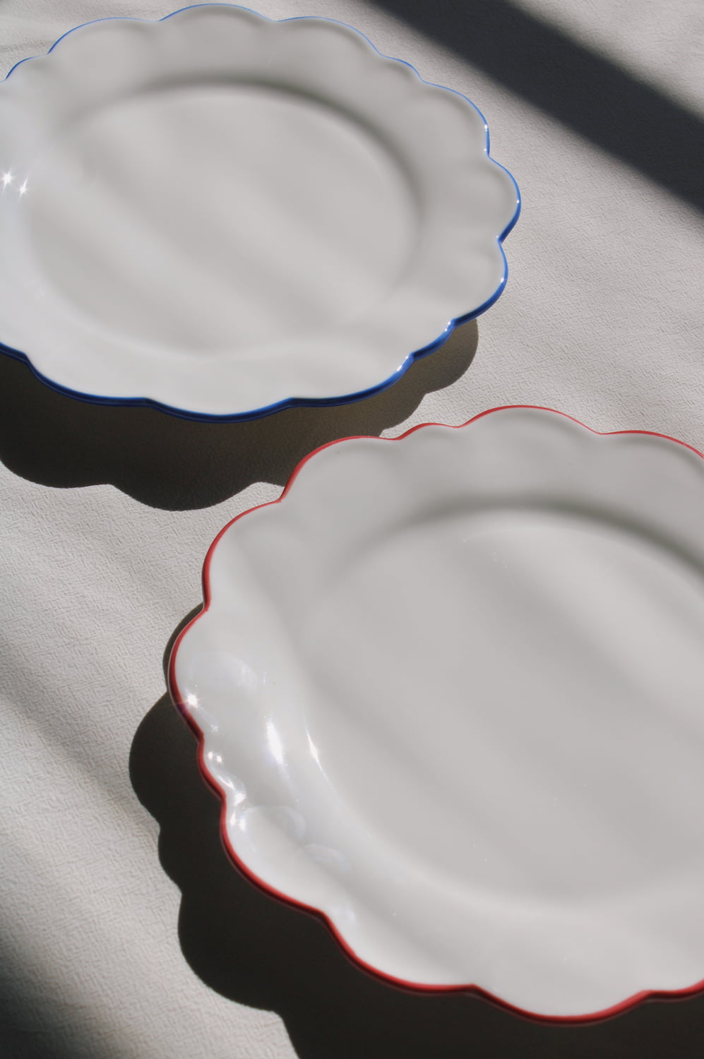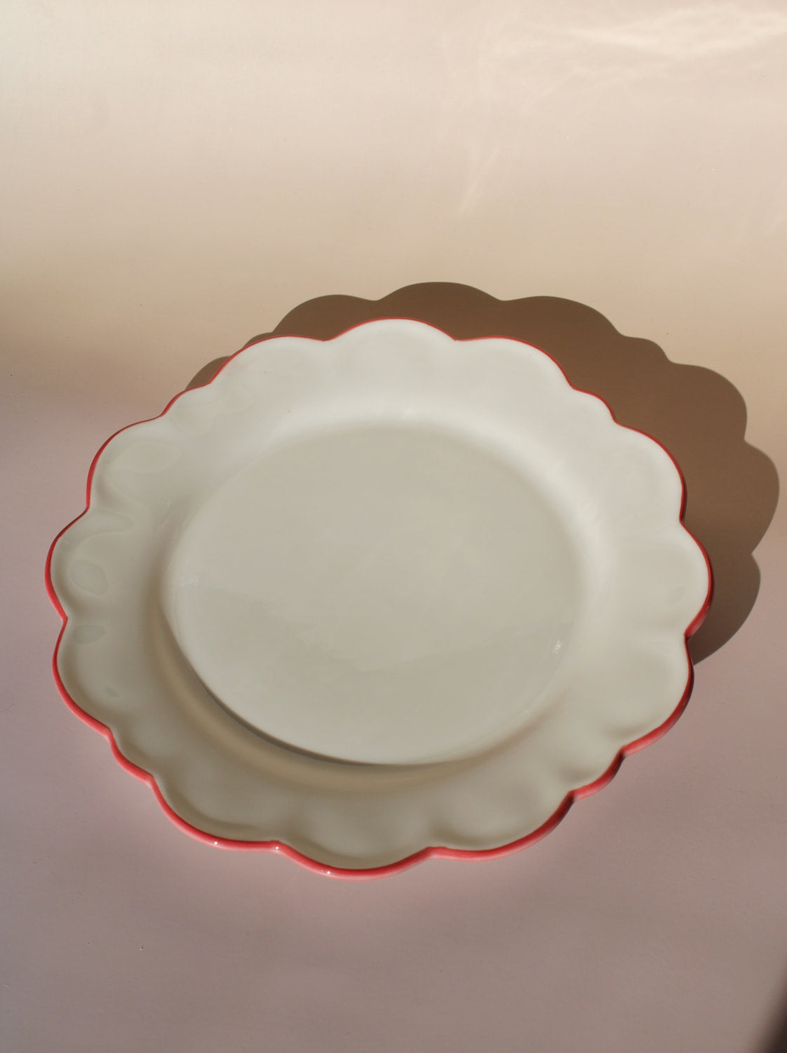 Sweet and sophisticated, the Pia plate features graceful scalloped edges accented with a warm red trim that brings gentle warmth to your table. The delicate curves and classic white finish create a timeless piece perfect for intimate dinners or adding romance to everyday meals. This lovely plate embodies vintage elegance with modern functionality.