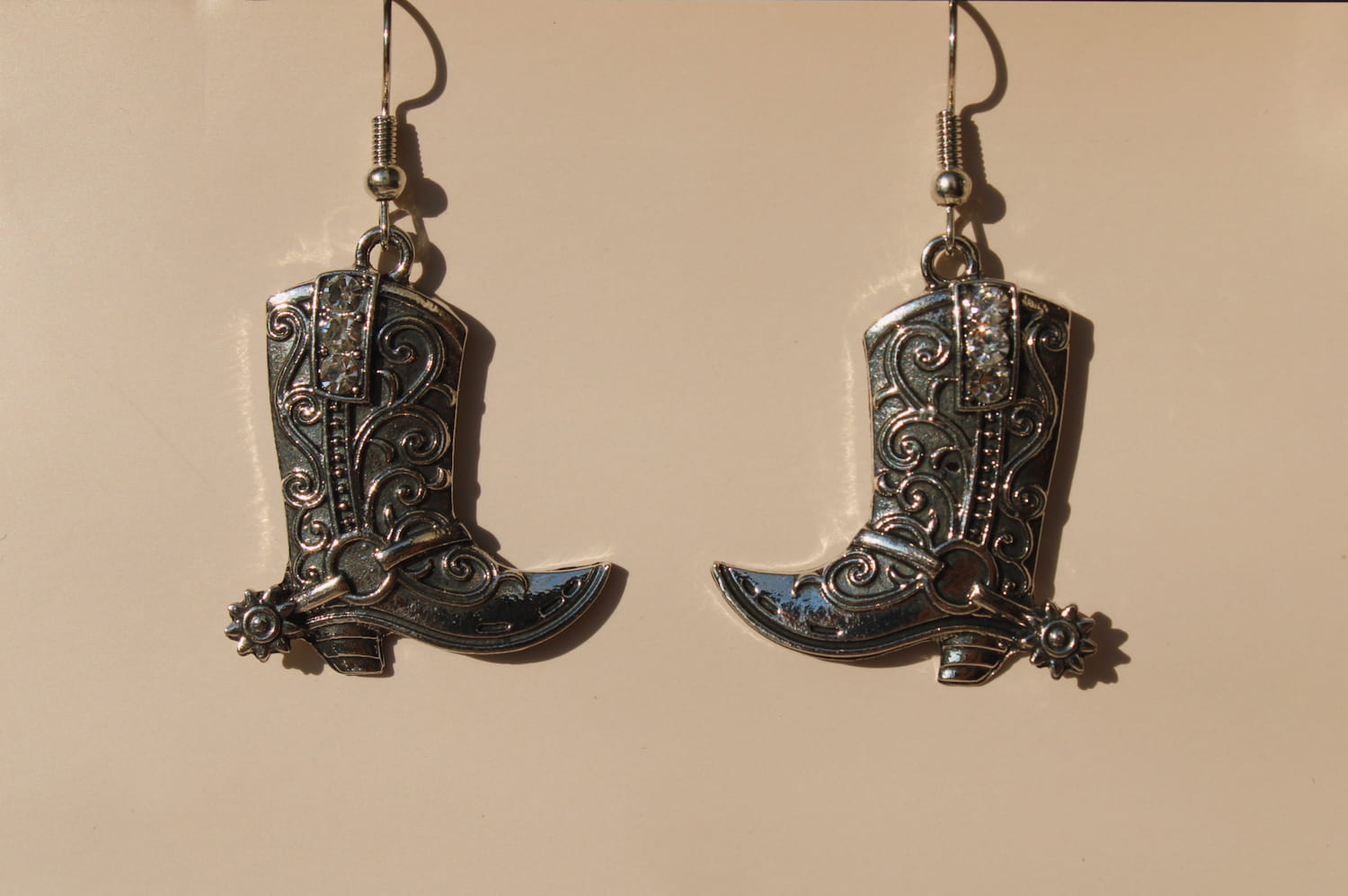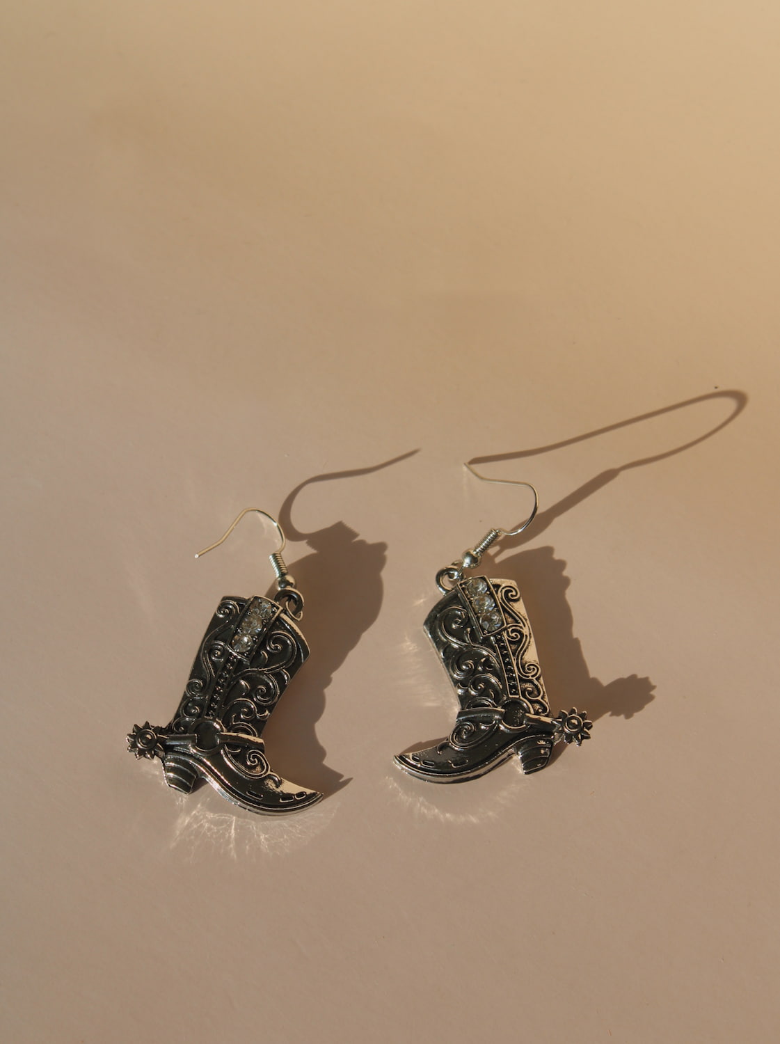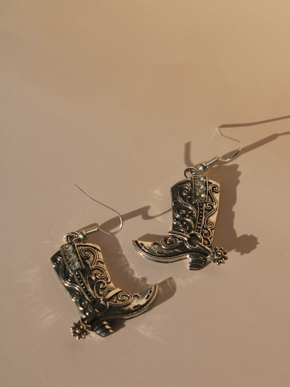 A playful nod to Western charm, the Rodeo Earrings are shaped like intricately detailed cowboy boots, complete with tiny spurs and swirling accents. Their silver-toned finish brings a vintage glow, making them the perfect conversation starter for everyday looks or styled-up evenings.