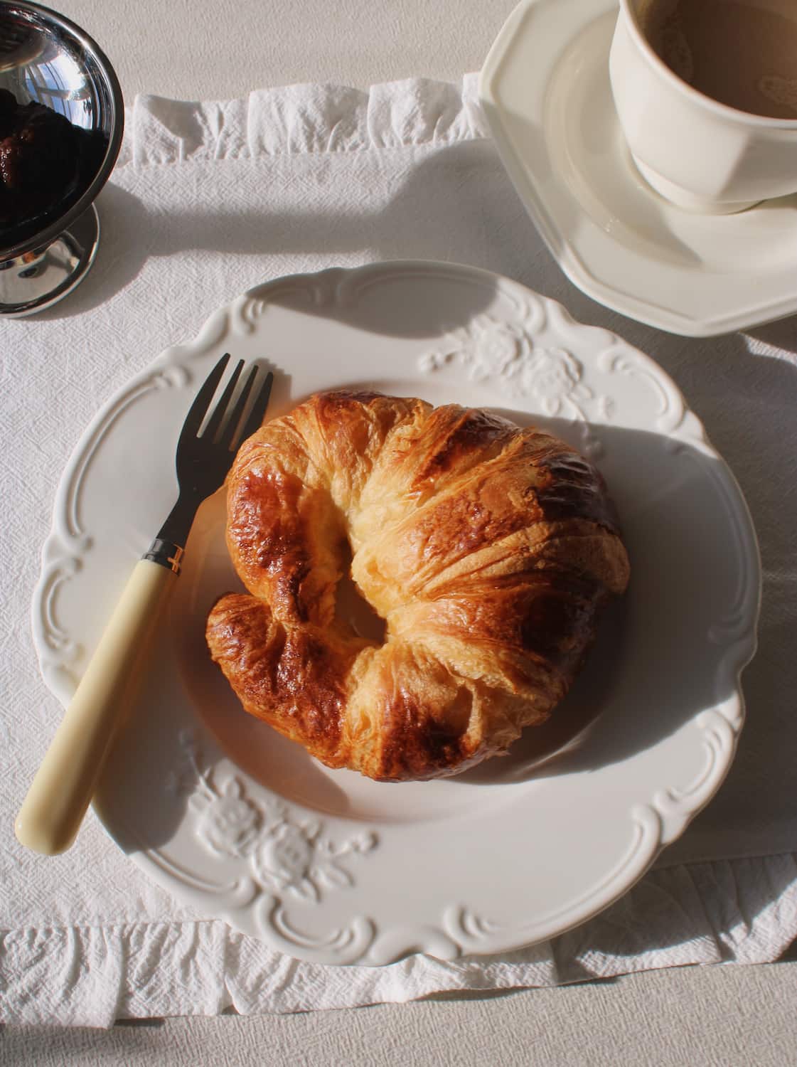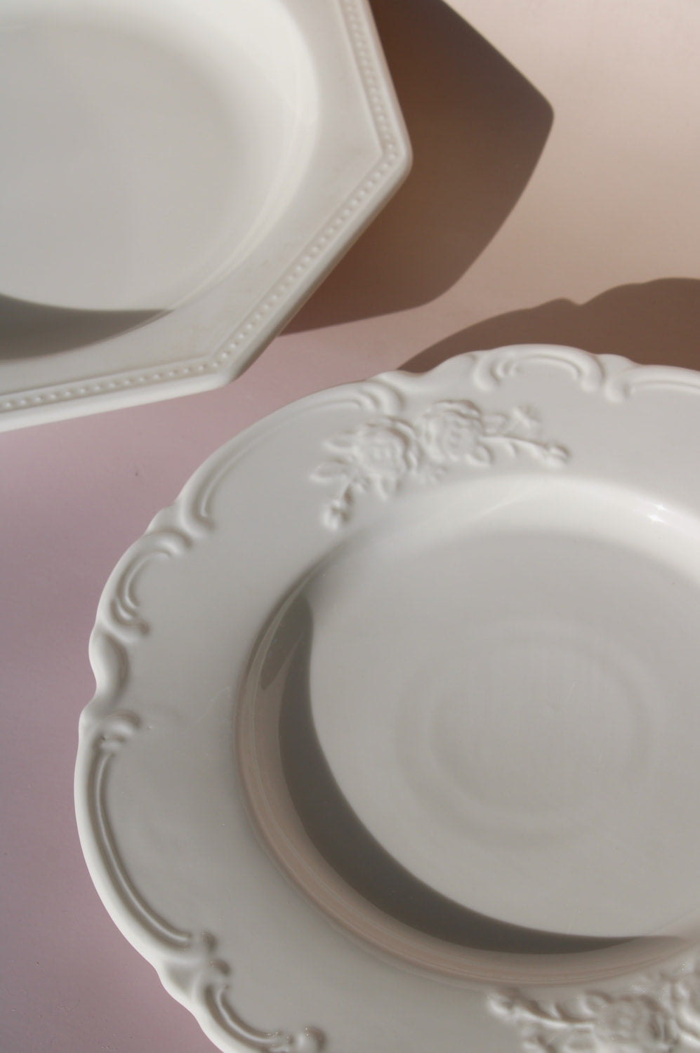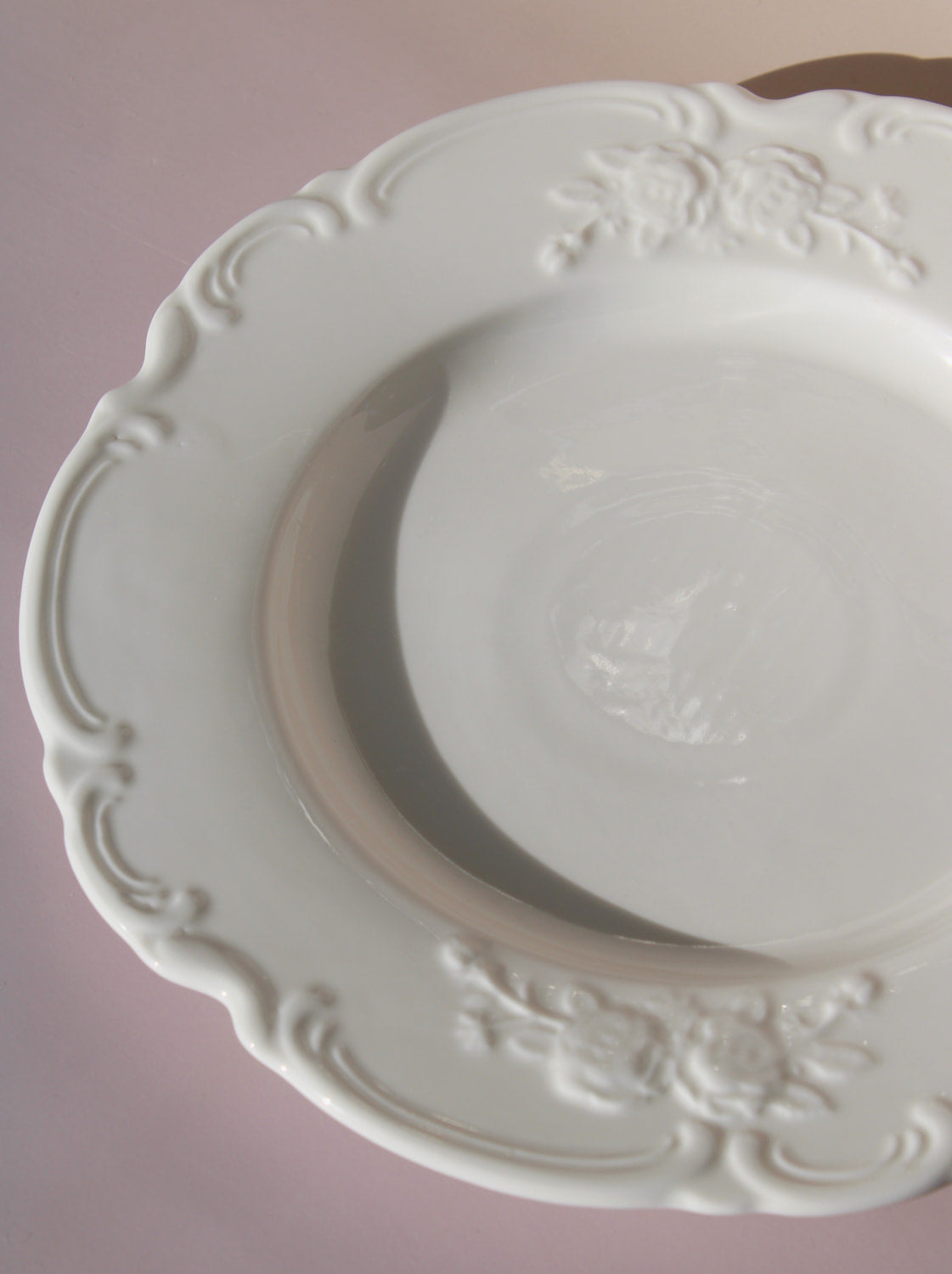 The Roselle Plate brings delicate romance to your table with its intricate embossed floral motifs that dance around the scalloped rim. Each rose and vine detail is carefully crafted into the ceramic, creating subtle shadows and textures that catch the light beautifully.