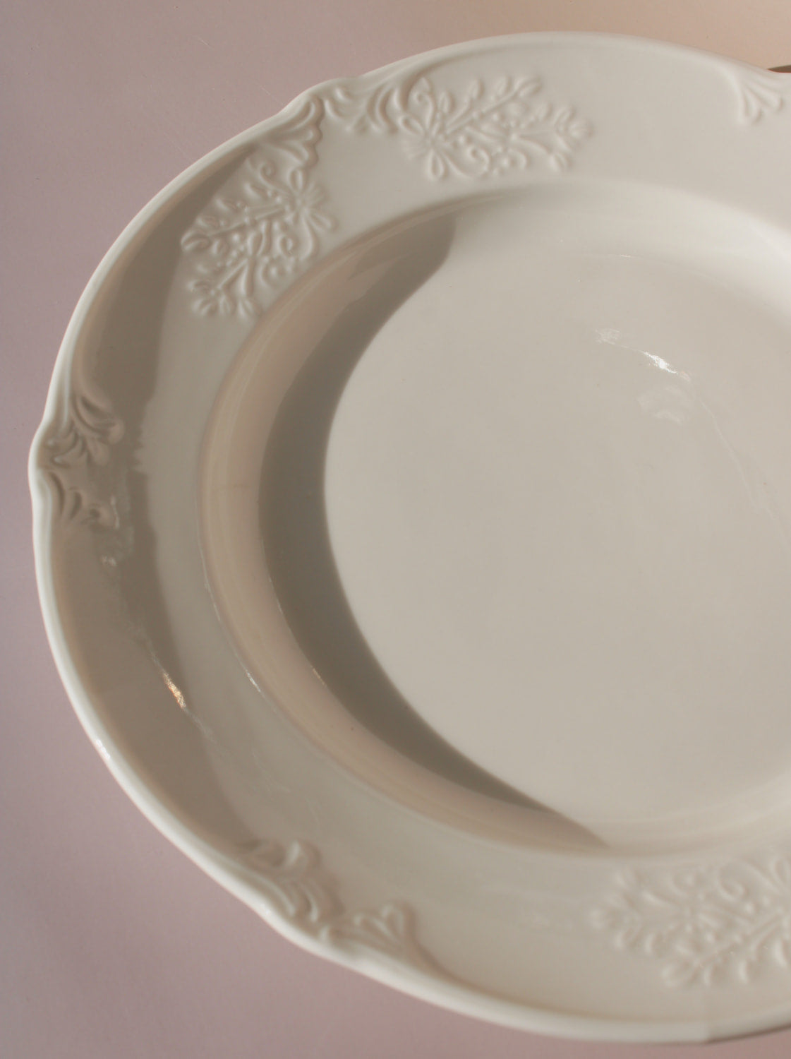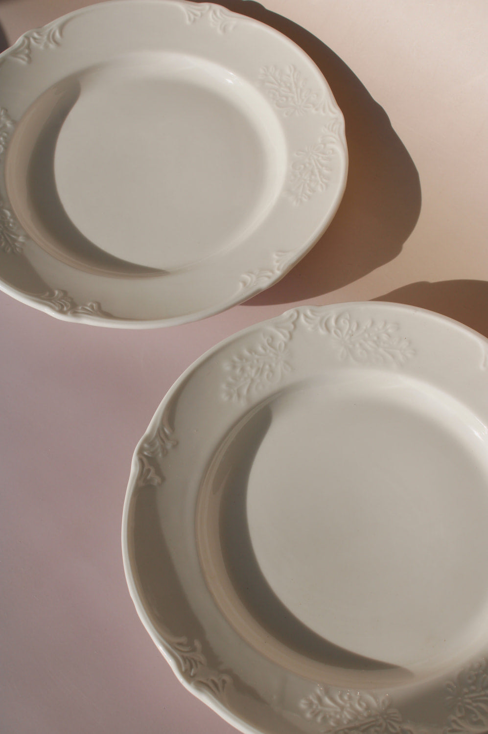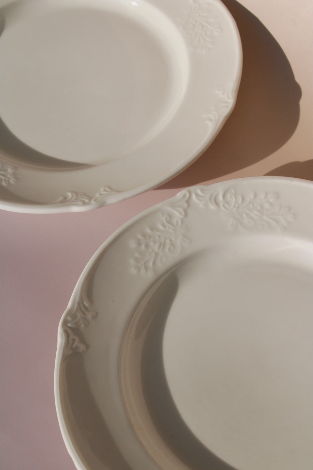 The Rosette Plate brings classical elegance to your dining table with its perfectly proportioned round silhouette and intricate embossed floral details. Delicate roses and flowing vine motifs are carefully crafted into the ceramic around the scalloped rim, creating depth and texture that elevates every meal presentation.