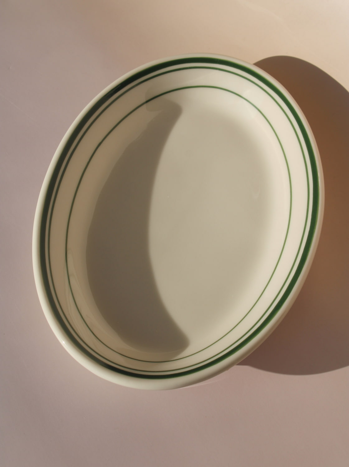 The Verde Plate brings fresh, natural elegance to your table with its distinctive green line accents that trace gentle circles around the cream ceramic surface. The elongated oval shape makes it perfect for presenting everything from breakfast toast and eggs to elegant appetizers and shared plates.