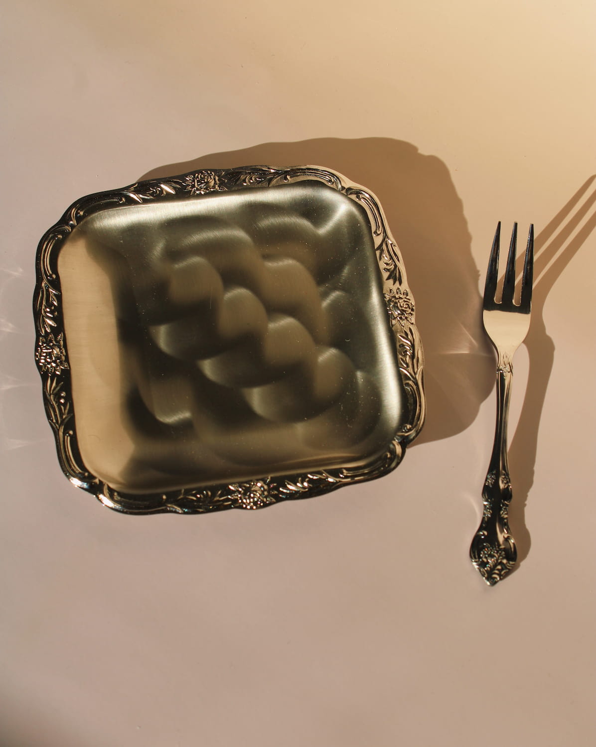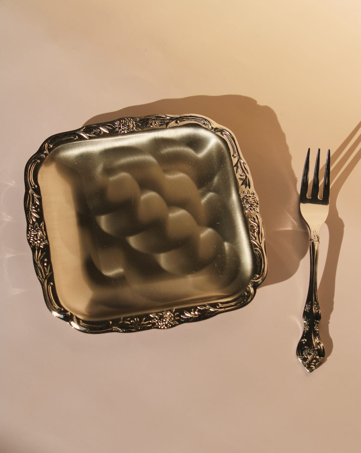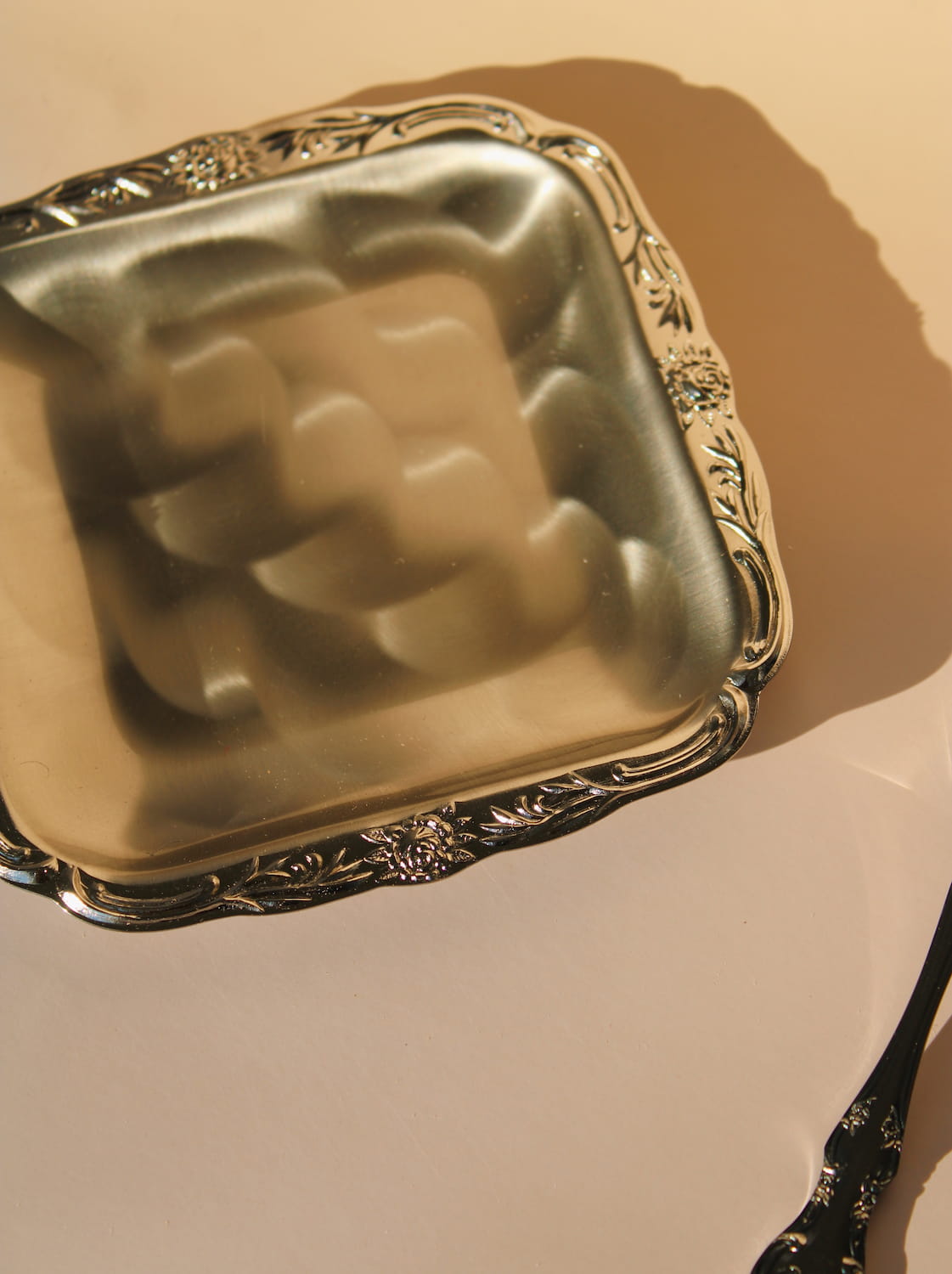 Um achado raro no Japão, a bandeja Estelle traz a elegância do velho mundo para o entretenimento moderno. Esta autêntica peça vintage banhada a prata apresenta bordas florais intrincadas e um acabamento brilhante que reflete a luz com perfeição. Cada bandeja é uma descoberta única, proveniente de artesãos japoneses e carregando sua própria história de artesanato.