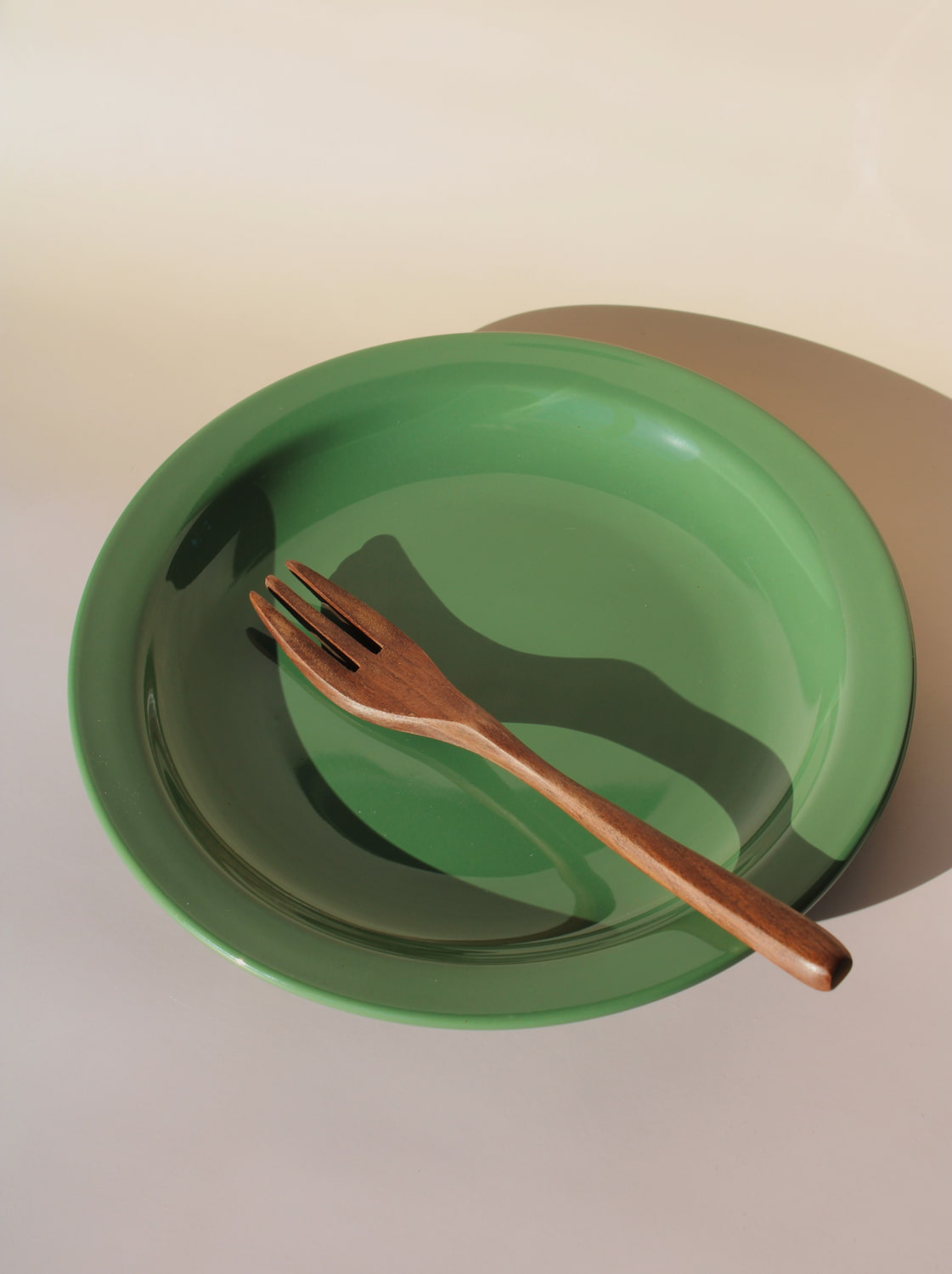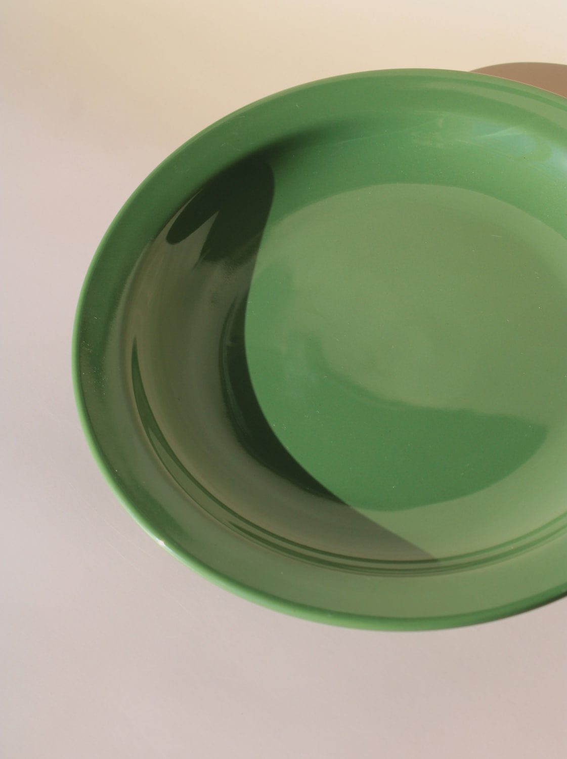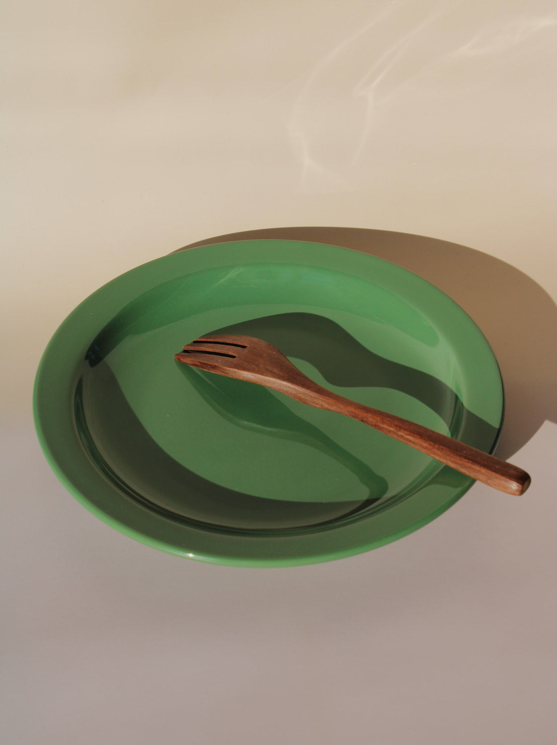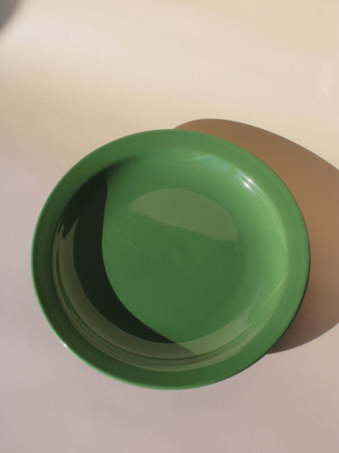Milo-plattan påminner om den djupa stillheten i gröna landskap - en lugnande nyans balanserad med en glansig finish. Dess böjda kanter och mjuka runda form ger både funktion och subtilt konstnärskap till bordet, oavsett om det används till frukost, sallader eller ett lugnt kvällssnack.