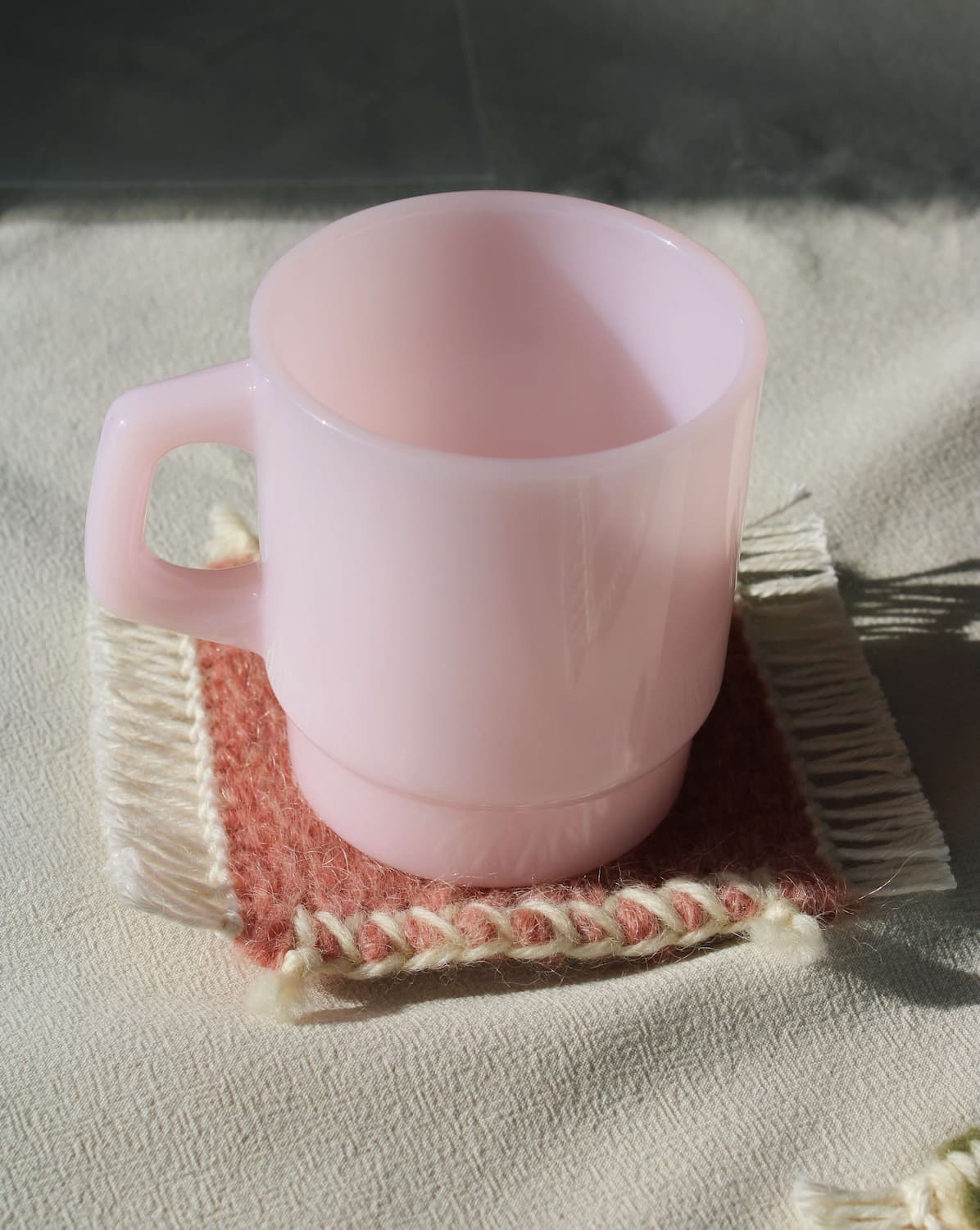 Mjuk som morgonens första ljus glittrar Rosé Glow Muggen i ömma rouge toner. Minimal form men ändå rik på närvaro, förvandlar den varje klunk till ett ögonblick berört av värme och stillsam skönhet.